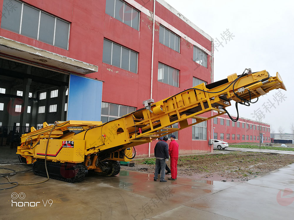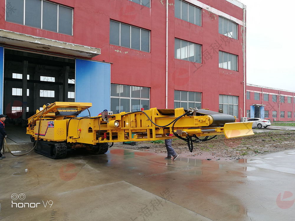 煤矿井下用矸石填充机(回填机-抛矸机)以带宽皮带机为运输工具。可伸缩皮带机反向运转,机头位于巷道口,作为受料端;移动机尾就是填充机送料卸载机构,作为卸料端。填充机的卸载滚筒组代替皮带机尾,与皮带机标准h架采用间隙衔接。皮带机矸石运到填充机的卸载滚筒,卸载滚筒再将其卸到抛射皮带上,抛填到巷道。抛射皮带可在巷道宽度范围内上下左右摆动,能将整个巷道在宽度范围内填满矸石。当前面填满后,充填机向后退移一个步距(约4m)皮带机储带与自动张紧装置能将松弛的皮带自动张紧。如果在退移过程中,行走机构偏离了皮带机中心一定距离,就会使其上的卸载滚筒同样偏离这一距离,则皮带将在运行中因此而跑偏,这时,通过操纵调偏液压操纵阀手柄,调偏油缸拉动调偏架向跑偏侧偏移,直到将跑偏量完全克服,使皮带恢复正常运转。如果填充机向后退移时与皮带机偏移了一定角度,卸载滚筒架在皮带拉力的作用下,将沿拉力方向绕卸料点转动,直至与皮带拉力方向一致。如果巷道底板左右不平,通过操纵调平液压操纵阀手柄,驱动调平千斤顶活塞杆上下动作,调整卸载滚筒水平。总之,通过自动调偏、调向及水平调整,能使卸载滚筒始终与皮带机的机头驱动滚筒保持轴线平行,中心相同,方向一致,保证皮带机能够正常运行。
