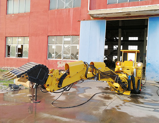 巷道修复机工作部根据修复需要,挖斗、铣挖头、破碎锤、托梁器通过液压快换器,可快速互换。利用挖斗挖装煤岩,将煤或者岩石装载到刮板运输机、皮带运输机、矿车或其他装载设备上,同时工作臂能左右摆动±45°、旋转±180°、上下升降380mm,对巷道侧帮、顶板等进行修护作业;液压破碎锤能破碎巷道内较硬岩石、混凝土;铣挖切割头能开挖毛水沟或巷道周边铣槽;托梁器能配合架棚支护;机器小臂上设有水切割机械手,可根据修复作业需要,随时切割钢筋、锚杆、锚索、u型钢等金属支护材料。